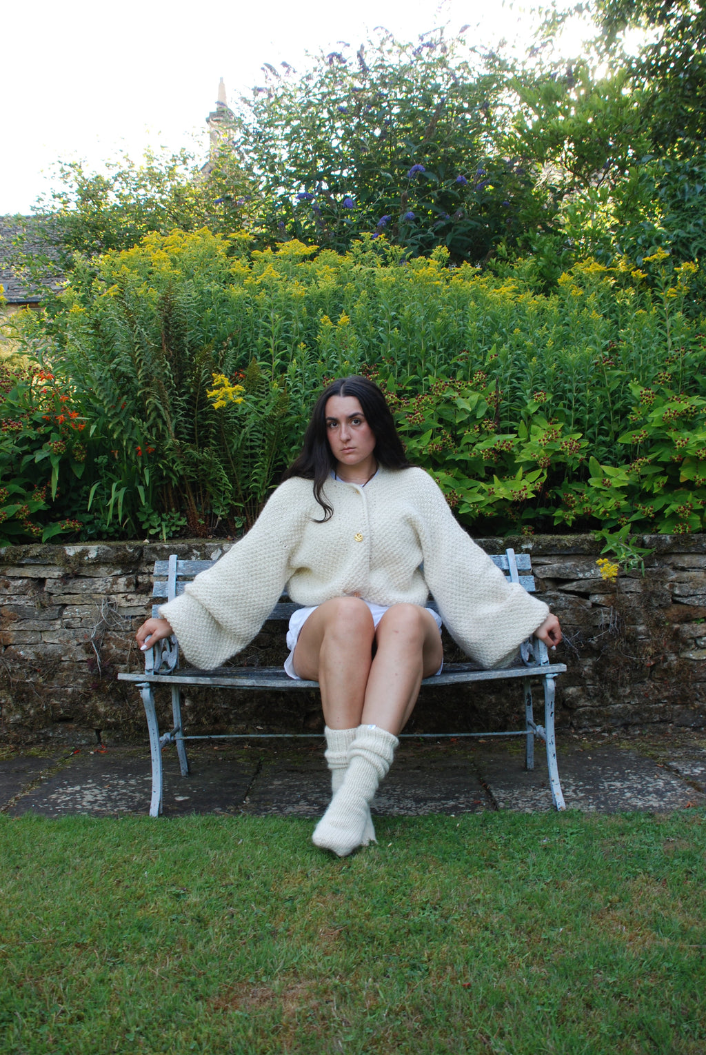 Introducing our brand-new artisan knitted cardigan, with ballon sleeves and a button up front crafted from luxurious Cotswold wool and proudly made in the UK. We prioritise sustainability at every stage of the production process, ensuring that the materials and practices used are eco-friendly.