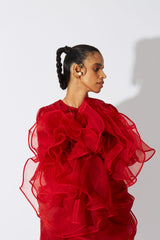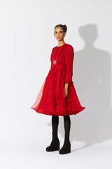 A three layered red dress cut in 45 meters of luxurious silk organza with laboriously bound exposed multi-seam panels all over. The dress comes with a delicate QUOD garter style belt with buttons and ruffle detailing in pure silk.