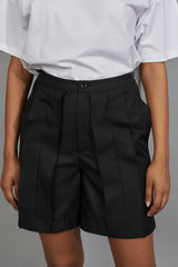 A pair of tailored shorts with exposed seam panels on front and exposed darts at the back.
