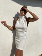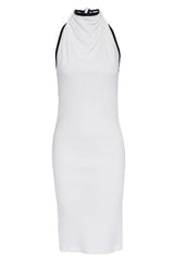 A must have on your next tropical vacation, the GAIA knit dress gives you an easy pull on feel with the sexiness of a bare back. Don't want to go backless? Wear your bathing suit top or sports top with her. The eco conscious tencel knit is a breathable cotton while holding you in. The tie back halter drapes in the front, rolls tight or drapes high neck with thick black bindings as accent.