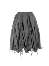 An asymmetrical skirt in fine suiting with multiple vertical gathered panels all around the flare.