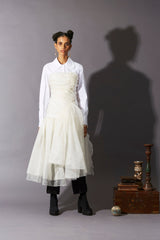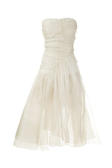 A corset style structured top covered in lines of gathered silk organza stitched into an uneven hemmed flare.