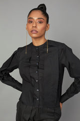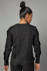 A black poplin top with exposed seam panels and buttoned placket on the front, and exposed darts at the back.