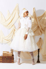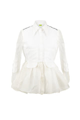 A silk organza, poplin-lined shirt with multiple faux pocket flaps and an original foliage mirror print on the back.