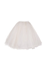 A layered silk organza and ivory tulle skirt with signature exposed seam panels all around the flare.