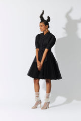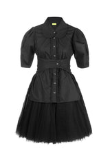 A puffed sleeves poplin and net dress with ruffle placket, wrapped peter pan collar and sleek knife pleated belt for a cinched waist.