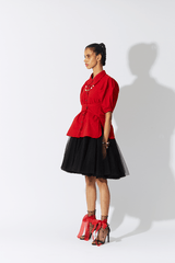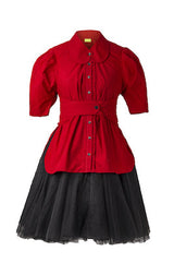 A puffed sleeves poplin and net dress with ruffle placket, wrapped peter pan collar and sleek knife pleated belt for a cinched waist.