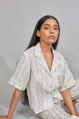 An airy shirt in plush silk organza printed with an original QUOD label print all over and lime green detailing. It comes with a cotton lining on the inside.