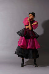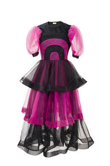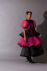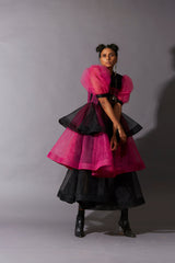 A triple tiered puff sleeved dress in alternating panels of magenta and black.