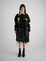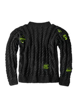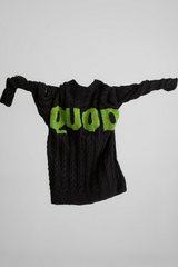 A handknit oversized pullover with rips and patchwork and a bold QUOD type at the back. Can be worn either side front.