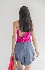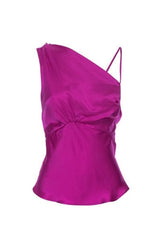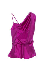 The Thalia blouse is just as stunning in the back as it is in the front. Loosely inspired by the Grecian pallium, this bias draped one shoulder blouse has an open strap back to give you a free, loose and breezy feel. The color of the silk is in a striking Regal Magenta. Slip her on for instant sex appeal and pair her with any bottom.