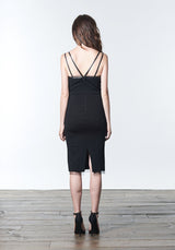 Zoe is the dress to have forever. This Tencel knit (aka recycled cotton) is although a curve hugging, it is also one of our most flattering classic dresses that camouflages everything, The thick tencel knit comfortably holds you in and up. Taking a classic and adding many details, we have added upcycled double leather straps, silk mesh trims, and a high back slit. This dress is fully lined in upcycled modal cotton.