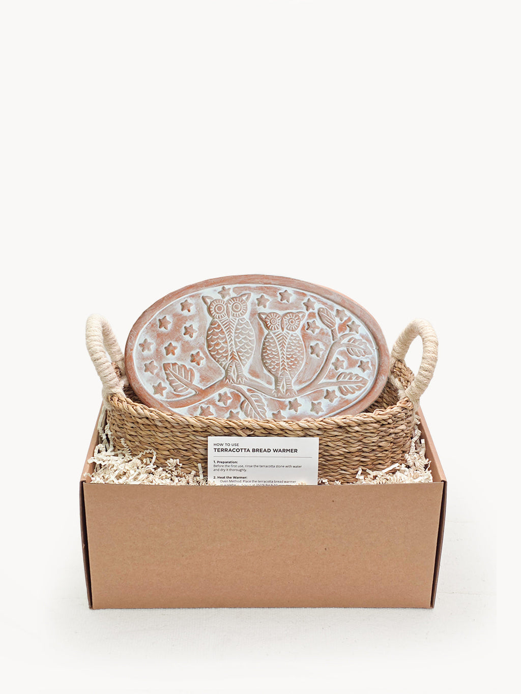 There’s nothing quite like the smell of warm bread on the weekend. Here, our terracotta plate has been engraved with the cute owls on a tree design and cut to fit neatly into an oval basket. This special bread warmer is naturally insulating, and the basket itself has been handwoven from sustainably grown seagrass. It’s the best gift item for anyone who loves bread!